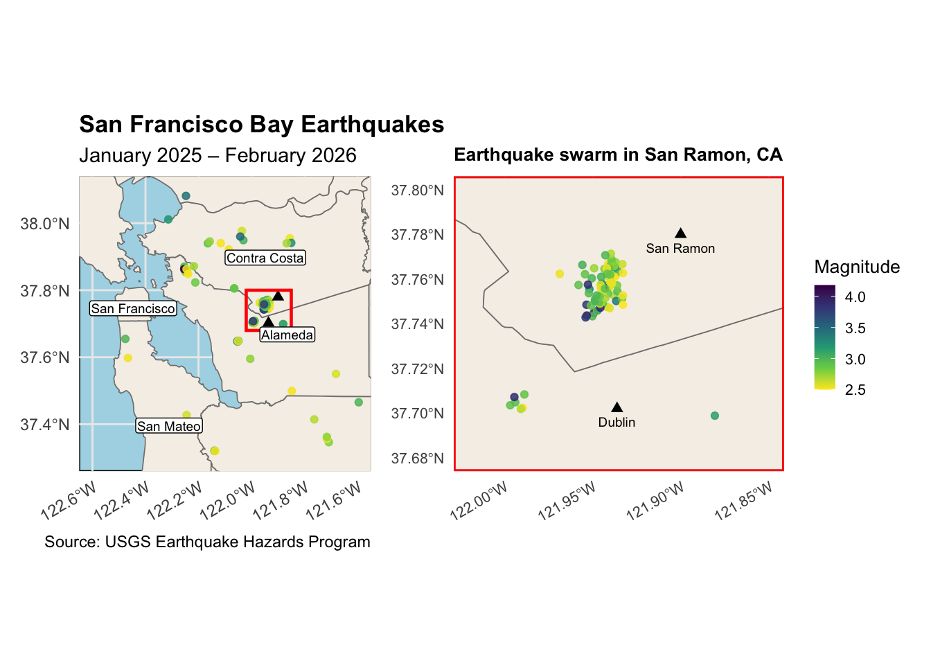# Convert to an sf object# This adds a geometry column from your lat/lon columns# this is san ramon specific -- the smaller inset mapsanramon_sf <-st_as_sf( sr_quakes,coords =c("longitude", "latitude"), # x first, then ycrs =4326,remove =FALSE# keep the original lat/lon columns too)# for the wider bay area -- the larger mapbayarea_sf <-st_as_sf( bayarea,coords =c("longitude", "latitude"), # x first, then ycrs =4326,remove =FALSE# keep the original lat/lon columns too)# Download California county boundariesca_counties <- tigris::counties(state ="CA", cb =TRUE) |> sf::st_transform(4326) # make sure CRS matches our earthquake data# Using a single object means the rectangle and the inset zoom# are guaranteed to match each other — no copy-paste errors# smaller insetinset_xlim <-c(-122.02, -121.85)inset_ylim <-c(37.68, 37.8)# add a couple of city landmarkslandmarks <-data.frame(name =c("San Ramon", "Dublin"),lon =c(-121.900, -121.936),lat =c(37.780, 37.702) )# Map 1: Bay Area overview ---map_overview <-ggplot() +geom_sf(data = ca_counties,fill ="#f5f0e8",color ="gray50",linewidth =0.3) +geom_sf(data = sanramon_sf,aes(color = mag),alpha =0.85 ) +geom_sf(data = bayarea_sf,aes(color = mag),alpha =0.85 ) +geom_point(data = landmarks,aes(x = lon, y = lat),shape =17, # filled triangle shapesize =2,color ="black" ) +scale_color_viridis_c(name ="Magnitude",option ="viridis",direction =-1# reverse direction for color gradient intution ) +# Draw the rectangle using the same coords as the inset# This is what visually connects the two maps# put the rectangle UNDER geom_sf_labels, else it might cover a labelgeom_rect(aes(xmin = inset_xlim[1], xmax = inset_xlim[2],ymin = inset_ylim[1], ymax = inset_ylim[2]),fill =NA, # transparent interiorcolor ="red", # red border so it stands outlinewidth =0.8 ) +geom_sf_label(data = ca_counties,aes(label = NAME),size =2.5,nudge_y =-0.012,label.padding =unit(0.1, "lines")) +coord_sf(xlim =c(-122.6, -121.6), ylim =c(37.3, 38.1)) +labs(title ="San Francisco Bay Earthquakes",subtitle ="January 2025 – February 2026",caption ="Source: USGS Earthquake Hazards Program",x =NULL, y =NULL ) +theme_minimal() +theme(plot.title =element_text(face ="bold", size =13),axis.text.x =element_text(angle =30, hjust =1),panel.background =element_rect(fill ="lightblue"),# remove legend from overview — it lives in the insetlegend.position ="right" )# Map 2: San Ramon detail inset ---map_inset <-ggplot() +geom_sf(data = ca_counties,fill ="#f5f0e8",color ="gray50",linewidth =0.3) +geom_sf(data = sanramon_sf,aes(color = mag), alpha =0.85 ) +scale_color_viridis_c(name ="Magnitude",option ="viridis",direction =-1 ) +coord_sf(xlim = inset_xlim, ylim = inset_ylim) +labs(title ="Earthquake swarm in San Ramon, CA",x =NULL, y =NULL ) +theme_minimal() +theme(plot.title =element_text(size =8, face ="bold"),plot.caption =element_text(size =6),axis.text =element_text(size =6),axis.text.x =element_text(angle =30),legend.position ="none",legend.title =element_text(size =7),legend.text =element_text(size =6),legend.key.size =unit(0.4, "cm"),plot.background =element_rect(fill ="#f5f0e8",color ="red", linewidth =0.8) ) +geom_point(data = landmarks,aes(x = lon, y = lat),shape =17, size =2,color ="black") +geom_text(data = landmarks,aes(x = lon, y = lat, label = name),size =2.5,nudge_y =-0.006) # shift label slightly below the point# Embed the inset into the overview ---# annotation_custom() places a grob at specific coordinates# grob is the smaller map inset of san ramon# The x/y values here are in the DATA coordinates of map_overview# so we use longitude/latitude values to position itmap_final <- map_overview +annotation_custom(grob =ggplotGrob(map_inset), # convert ggplot to embeddable grobxmin =-122.13, xmax =-121.55, # horizontal position in lon degreesymin =37.28, ymax =37.62# vertical position in lat degrees ) +# add line segments to connect the small red rectangle to map insetannotate("segment",x =-122.02,xend =-122.065,y =37.68, yend =37.62,color ="red",linewidth =0.8) +annotate("segment",x =-121.85,xend =-121.61,y =37.68, yend =37.62,color ="red",linewidth =0.8)#map_final