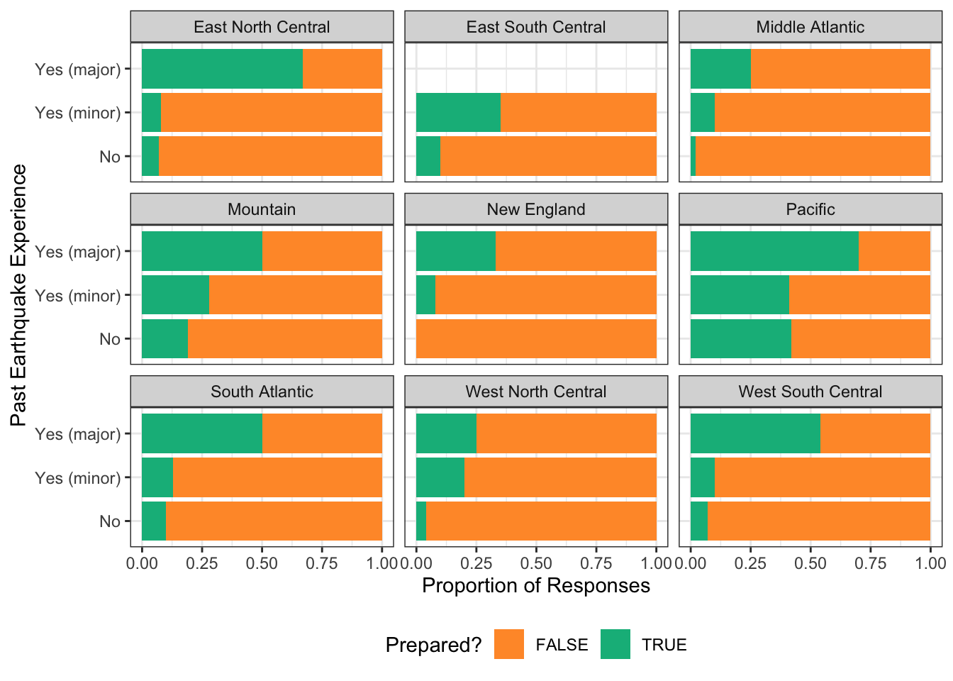 #sum(complete.cases(san_andreas)) # complete responses#sum(!complete.cases(san_andreas)) # incompleted responses#nrow(san_andreas) # total responses#san_andreas |> dplyr::filter(is.na(region)) |> View()san_andreas |>select(region, experience, prepared) |> dplyr::mutate(experience2 =case_when(experience =="No"~"No", experience =="Yes, one or more minor ones"~"Yes (minor)", experience =="Yes, one or more major ones"~"Yes (major)"),experience2 =factor(experience2, levels =c("No", "Yes (minor)", "Yes (major)")) ) |> dplyr::group_by(region, experience2) |> dplyr::count(prepared) |> dplyr::mutate(proportion =round(n/sum(n),2)) |># exclude incomplete entries dplyr::filter(experience2 !=is.na(experience2)) |> dplyr::filter(region !=is.na(region)) |>ggplot(aes(x = experience2,y = proportion)) +geom_col(aes(fill = prepared)) +scale_fill_manual(values =c("#ff9933", "#04b889")) +labs(x ="Past Earthquake Experience",y ="Proportion of Responses") +coord_flip() +facet_wrap(vars(region)) +theme_bw() +theme(legend.position ="bottom") +guides(fill =guide_legend("Prepared?"))