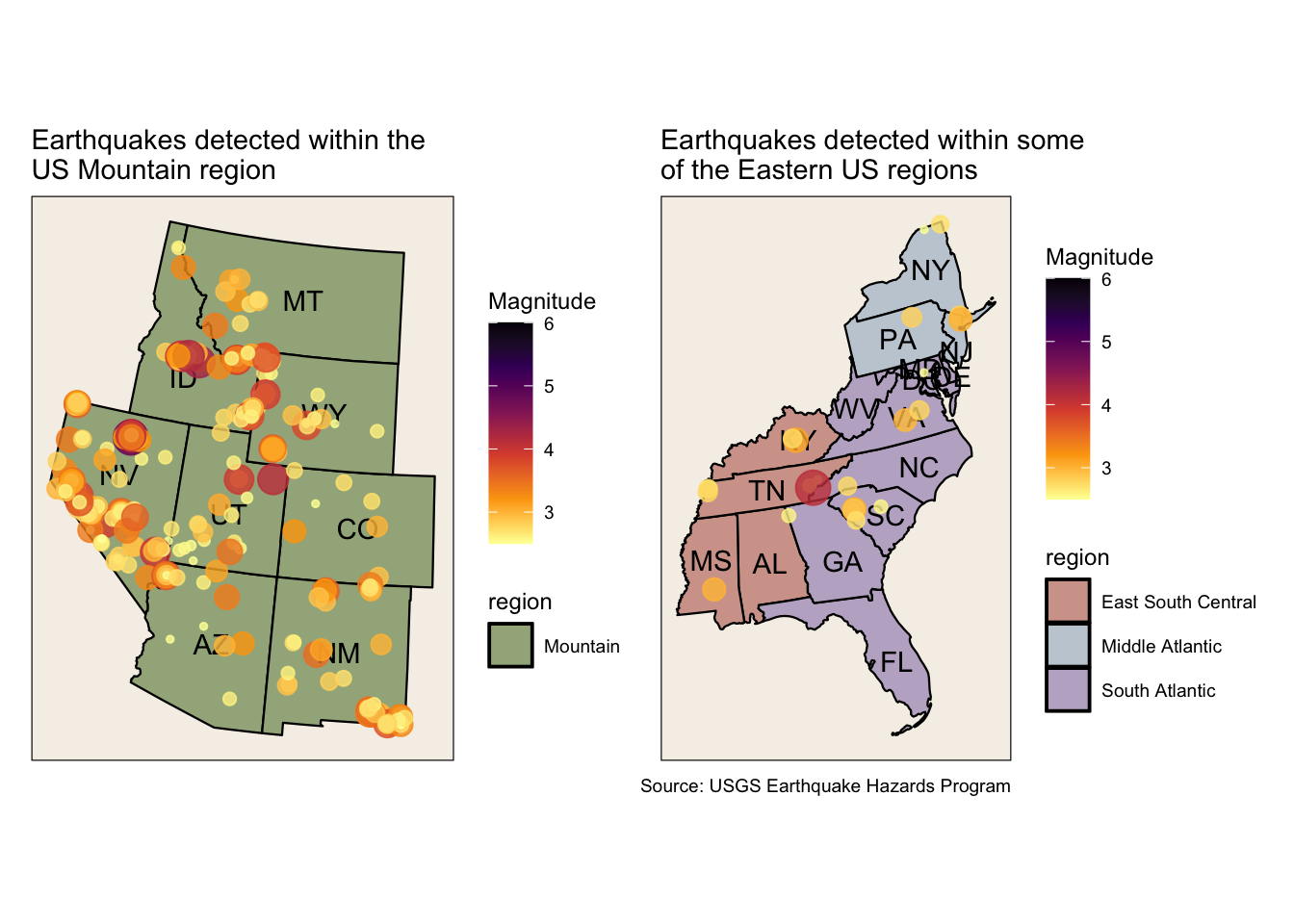 # mountain mapmountain_map <-# USE THIS -- do mountain region vs northwest centralplot_usmap(data = quake_count_choropleth,regions ="states",values ="region",labels =TRUE,label_color ="black",include = .mountain) +scale_fill_manual(values =c("#A3b18a")) +theme(legend.position ="right",panel.background =element_rect(color ="black", fill ="#f5f0e8")) +labs(title ="Earthquakes detected within the\nUS Mountain region") +geom_sf(data = usa_quakes |> dplyr::filter(region %in%"Mountain"),aes(size = mag, color = mag),alpha =0.8) +scale_color_viridis_c(name ="Magnitude",option ="inferno",direction =-1,limits =c(2.5, 6) ) +scale_size_continuous(guide ="none")#mountain_map# south atlantic map where Virginia isse_mid_atlantic_map <-plot_usmap(data = quake_count_choropleth,regions ="states",values ="region",labels =TRUE,label_color ="black",include =c(.south_atlantic, .east_south_central, .mid_atlantic)) +scale_fill_manual(values =c("#d2a39a", "#C4CDD6", "#bfb1cb")) +theme(legend.position ="right",panel.background =element_rect(color ="black", fill ="#f5f0e8")) +labs(title ="Earthquakes detected within some\nof the Eastern US regions",caption ="Source: USGS Earthquake Hazards Program") +geom_sf(data = usa_quakes |> dplyr::filter(region %in%c("South Atlantic", "East South Central", "Middle Atlantic")),aes(size = mag, color = mag),alpha =0.8) +scale_color_viridis_c(name ="Magnitude",option ="inferno",direction =-1,limits =c(2.5, 6) ) +scale_size_continuous(guide ="none")+guides(color =guide_colorbar(order =1))#se_mid_atlantic_mapmountain_map + se_mid_atlantic_map